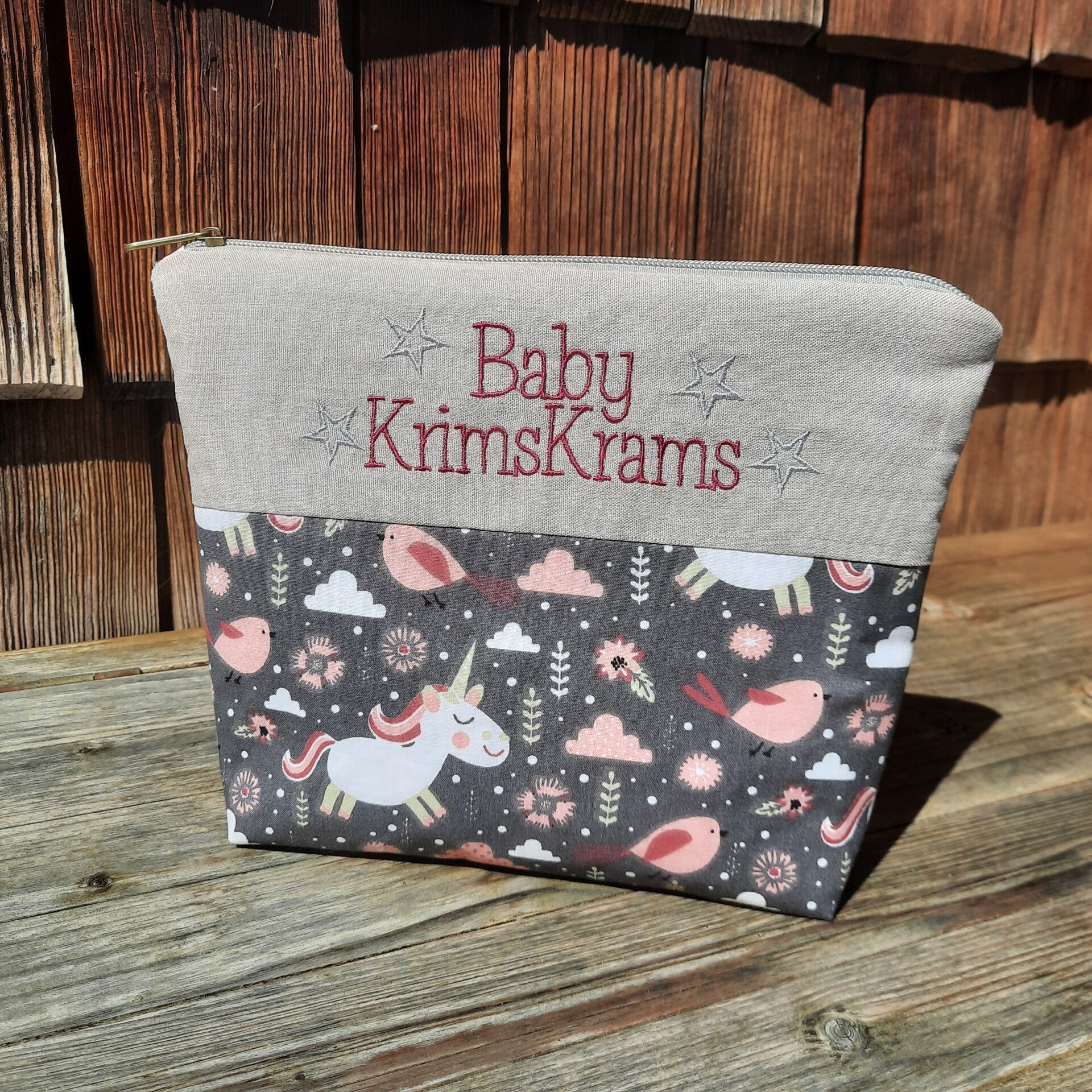 Genau deshalb hab ich meine Stickmaschine angeworfen und mit einer Portion Humor und Liebe diese herzigen Krimskrams-Tascherl in 2 Größen gezaubert!